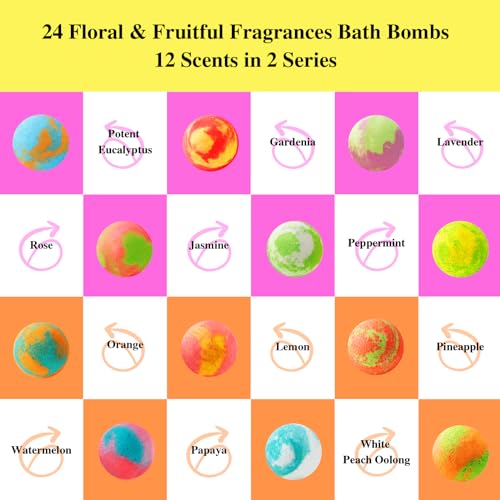 48 Bath Bombs, 3 Series: Our 48 Pack Bath Bombs set features 18 unique scents, grouped into three beautifully designed boxes. The Floral Euphoria series brings 12 bath bombs with a variety of botanical scents, while the Fruitful Bliss series complements with another 12 featuring citrus and sweet aromas. The Mix & Delight Series, boasting 24 bombs, ensures a delightful scent for every mood and preference. Each bath bomb is a unique aromatic journey