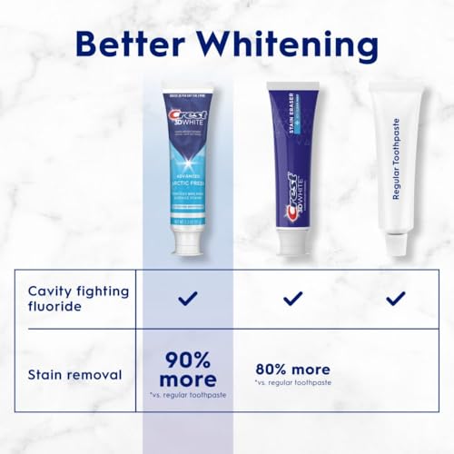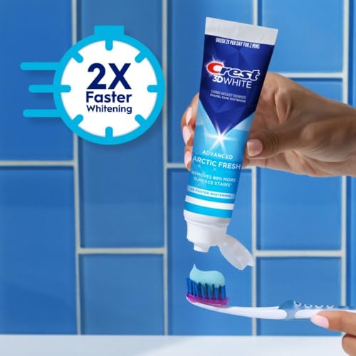 Brighten your smile with Crest 3D White Advanced Arctic Fresh Whitening Toothpaste. The new and improved formula removes 90% more surface stains*, protects against future stains & starts whitening your teeth after 1 brush. 3D White fluoride toothpaste also strengthens your tooth enamel and helps protect against cavities. *vs. regular toothpaste