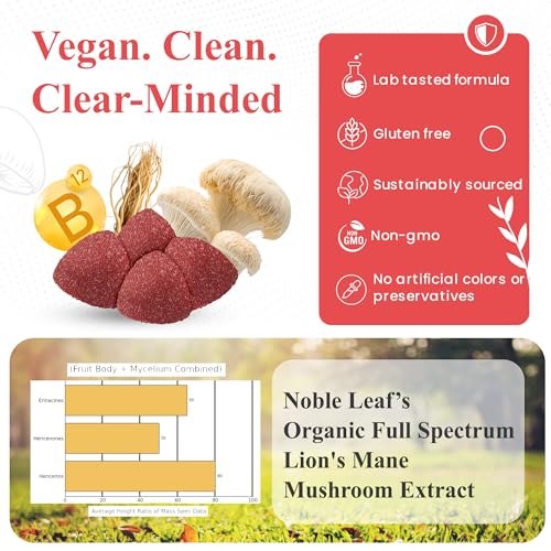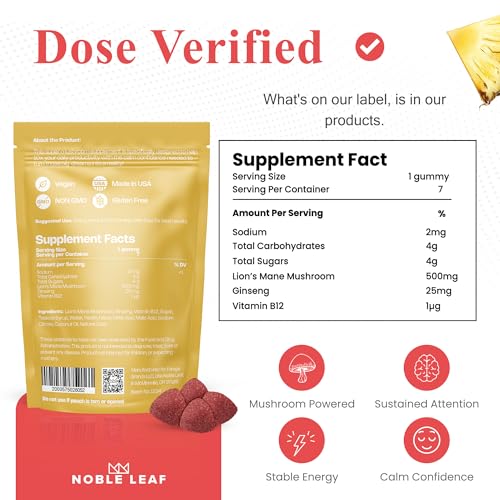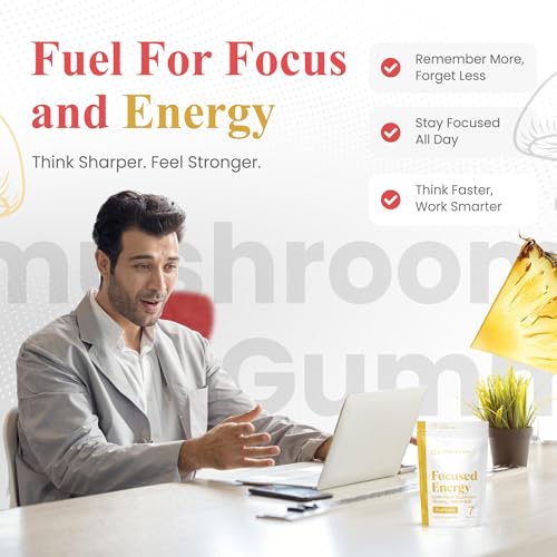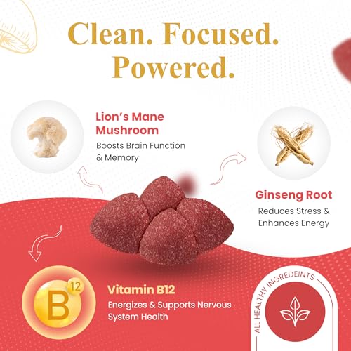 Lion’s Mane Mushroom Gummies for Focus and Energy – Focus Gummies for Adults with American Ginseng & B12 for Clarity & Natural Energy, Gluten Free, Fruit Punch Flavor, 7 Count