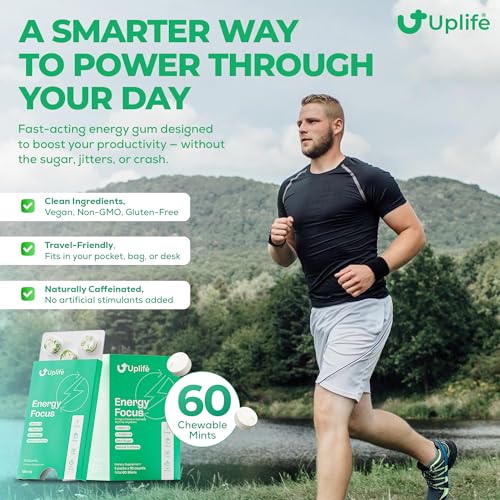 Uplife Energy + Focus Mints 60 Pieces – Fast-Acting 40 mg Caffeine Mint with 80 mg L-Theanine + Niacin Vitamin B3 & B12 + Sugar-Free & 100% Vegan – Caffeine Mints for Natural Energy Boost & Freshness