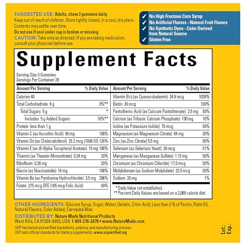 Nature Made Advanced Multi 50+ for Him Gummies is a dietary supplement with key minerals and vitamins for men to get daily nutritional support. These mens multivitamins provide 60% more total nutrients(1) plus an excellent source of Magnesium Citrate and all 8 B Vitamins per 3 gummies. This supplement also provides nutrients to support healthy blood pressure(2), cardiovascular, cognitive and immune function, muscle health, and energy metabolism(3). These mens multivitamins gummies are gluten free with no high fructose corn syrup, no artificial flavors – natural fruit flavors, and no synthetic dyes – color derived from natural source. Get high-quality mens vitamins and mens multivitamins 50 plus from Nature Made. Explore vitamins and supplements from Nature Made, including men’s daily multivitamin and gummy vitamins for men. USP has tested and verified ingredients, potency, and manufacturing process. USP sets official standards for dietary supplements. Visit the USP verified website for more information. (1)As compared to Nature Made Multi Gummies (2)Blood pressure already within normal range (3)Helps convert food into cellular energy These statements have not been evaluated by the Food and Drug Administration. This product is not intended to diagnose, treat, cure, or prevent any disease.