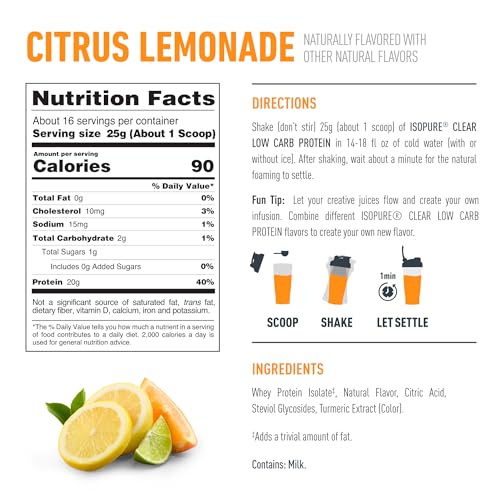 Isopure Clear Whey Isolate Protein Powder, Lactose Free, Gluten Free, Naturally Flavored, Citrus Lemonade, 20g Protein Per Serving, 14.1 Oz, 16 Servings (Packaging May Vary)