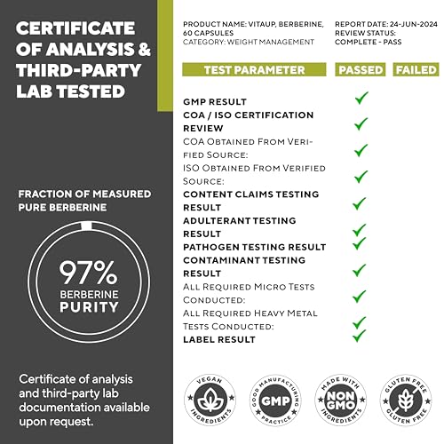 GMP CERTIFIED: Manufactured in an FDA-registered facility, VitaUp berberine supplement meets all the GMP standards. Each batch of our berberine supplements undergoes third-party lab testing for purity and potency. We do not use any GMOs, gluten, preservatives, or sweeteners.*