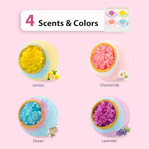 【LUXURY BATH SALTS FOR WOMEN – SOOTHING BATH TIME ESCAPE】 Treat yourself to a soothing soak with our 4 Pcs Crystal Sea Salt Bath Bomb Set. Each bomb releases a calming fragrance, including chamomile, ocean, lemon, and lavender, turning your bath into a relaxing retreat after a long day.