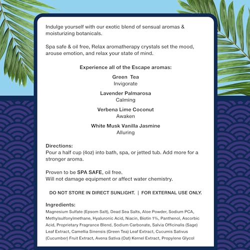 FOUR ESCAPE-INSPIRED BLENDS: This curated single use Relax Escape Collection invites you to unwind with Green Tea, Lavender Palmarosa, Verbena Lime Coconut, and White Musk Vanilla Jasmine—each crafted to bring resort-level luxury to your spa or hot tub.