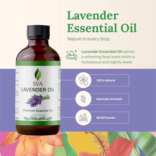 SVA Lavender Essential Oil – 4 Fl Oz – 100% Natural Lavender Oil – for Diffuser, Hair Care, Face, Skin Care, Aromatherapy, Scalp and Body Massage, Soap and Candle Making – with Dropper