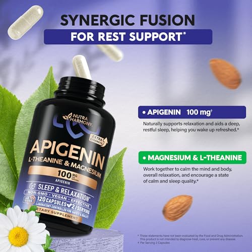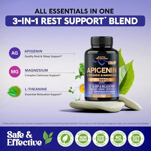 Apigenin 100mg – Apigenin Supplement for Sleep Support with L-Theanine & Magnesium – Sleep, Stress Relief & Relaxation Support for Adults – Naturally Derived from Chamomile – 120 Vegan Capsules