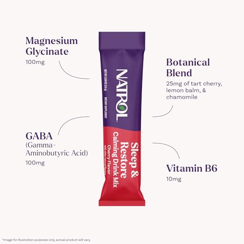 Experience a restful night’s sleep with Natrol Sleep & Restore Sleep supplement. This melatonin-free sleep magnesium glycinate supplement is specially formulated to help you unwind and is essential to your ultimate restorative sleep.(1) Each packet includes 100mg of magnesium glycinate and 100 mg GABA, plus 10mg of B6. Ideal for use as a magnesium sleep aid, this magnesium glycinate powder for sleep also features a botanical blend with 25mg of Tart Cherry, Lemon Balm, and Chamomile. In convenient magnesium powder packets, this product makes it easy to prepare your nightly magnesium powder calming drink. Simply add one stick to 8oz of hot or cold water, and enjoy the delightful cherry flavor as you prepare for a tranquil night’s rest. This sleep magnesium powder is also sugar-free and sweetened with stevia. Natrol Sleep & Restore is dedicated to providing a magnesium drink that is 100% drug-free and non-habit forming. (1) These statements have not been evaluated by the Food and Drug Administration. These products are not intended to diagnose, treat, cure, or prevent any disease. (2) Nielsen, xAOC, 52 weeks ending 1/25/25, Sleep Aid Supplements