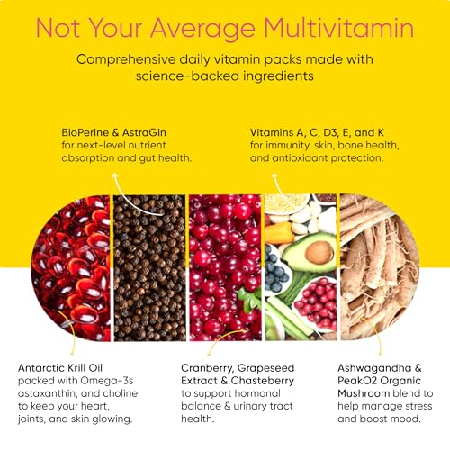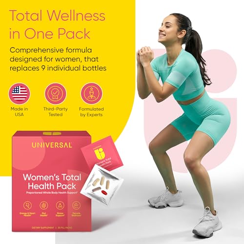 Universal U Total Health Vitamin Packs for Women – 30 Individual Capsule Packets For women who do it all – and need a health routine that can keep up. Between work, family, and trying to fit in a little “me time,” life can get overwhelming. That’s why we created the Women’s Total Health Pack, a daily vitamin solution that’s as dynamic as you are. Think of it as your wellness companion: compact, convenient, and packed with everything you need to feel strong, focused, and ready for anything. One Little Pack. Big-Time Benefits. Each womens supplement pack is loaded with 23+ essential vitamins and minerals including Vitamin A, C, D E, K, Thiamin, Riboflavin, Niacin, Vitamin B6, Folate, Vitamin B12, Biotin, D3 K2, to fill the gaps in your diet and help you tackle your to-do list with ease. These vitamin packets also go beyond a basic women multivitamin and contain premium extras including: Ashwagandha & PeakO2 Organic Mushrooms: Stay cool, calm, and collected with adaptogens that support your mental clarity, mood and stress levels. Antarctic Krill Oil: Rich in Omega-3 EPA DHA, astaxanthin, and choline for heart, joint, and skin health. Cranberry & Chaste Tree Berry: For hormonal and urinary tract support. BioPerine & AstraGin: Boosts nutrient absorption, so you get the most out of every dose. Better yet, these pre-portioned daily vitamins for woman replace over 24 separate supplement bottles and are individually sealed for freshness and portability, meaning they’re ready to go wherever life takes you. Whether it’s a busy workday, for travel or another packed schedule, managing your health has never been this effortless. Trusted Quality for 40+ Years Made in the USA with rigorous third-party testing, Universal U Total Health all in one multivitamin for women meets the highest standards of potency and quality. *Statements regarding dietary supplements have not been evaluated by the FDA and are not intended to diagnose, treat, cure, or prevent any disease or health condition